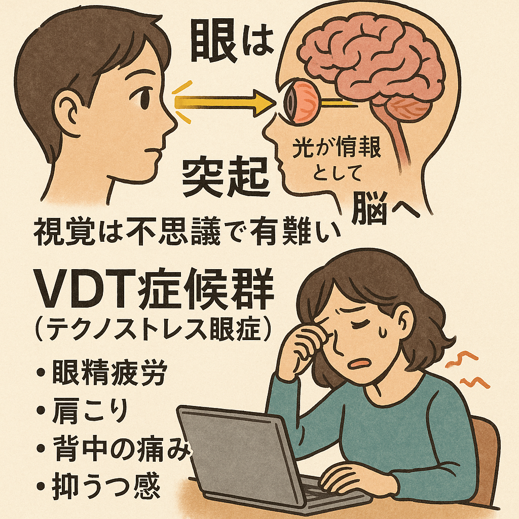 人は80〜90%の情報を視覚から得るといわれ、現代はパソコン作業で目を酷使する時代です。ワープロやパソコンの普及で問題になったのが**VDT症候群(テクノストレス眼症)**です。